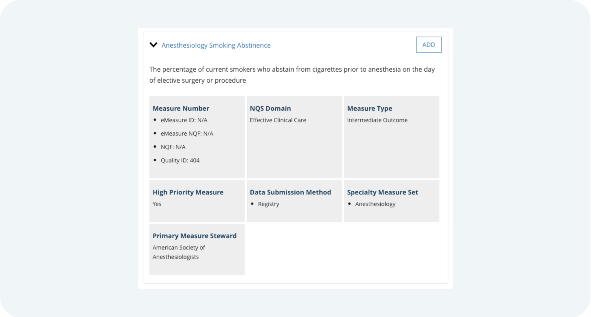 In the Anesthesiology measure set, there is a quality measure for preoperative smoking abstinence and beta-blocker usage in patients with history of CABG.